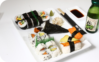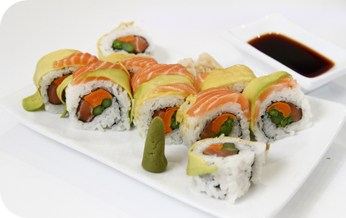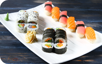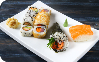| i.o סלמון, אבוקדות, עירית, טונה אדומה, גזר ובטטה במעטפת פנקו. |