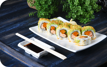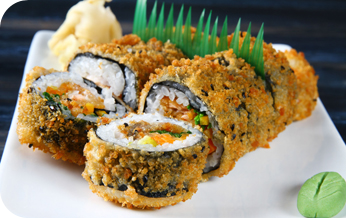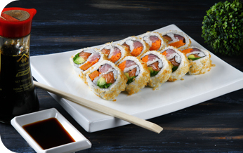 | i.o סלמון בטמפורה, אבוקדו, בצל ירוק ושיטקה בציפוי פנקו |