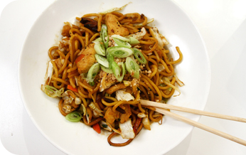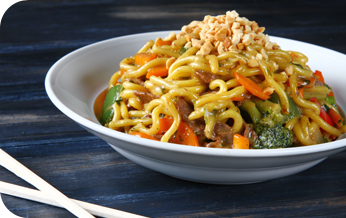 | נודלס עם עוף ברוטב על בסיס סויה, טריאקי וצ'ילי מתוק, מוקפץ בתוספת כרוב, גזר, סלרי, נבטים ופטריות שיטקה. מוגש בעיטור בוטנים. |