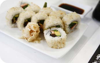 | i.o סלמון בטמפורה, בטטה, קנפיו ואספרגוס במעטפת אבוקדו ופנקו. |