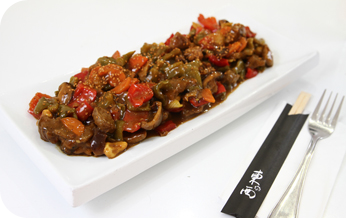 | בקר ברוטב סצ'ואן מוקפץ עם פלפלים בשני צבעים, גזר, בצל, פטריות שיטאקה וקשיו |