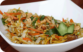 | נודלס עם בקר ברוטב לימון, כוסברה וקרם קוקוס, מוקפץ בתוספת בצל, גזר, פלפל בשני צבעים וברוקולי. מוגש בעיטור בוטנים גרוסים. |